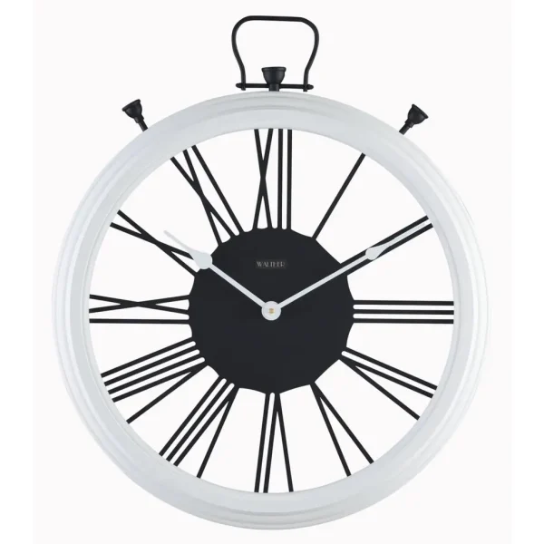 ساعت دیواری والتر مدل E6061WH ساعتی سبک مدرن با اعداد یونانی و قاب چوبی سفید و اعداد فلزی مشکی رنگ است.