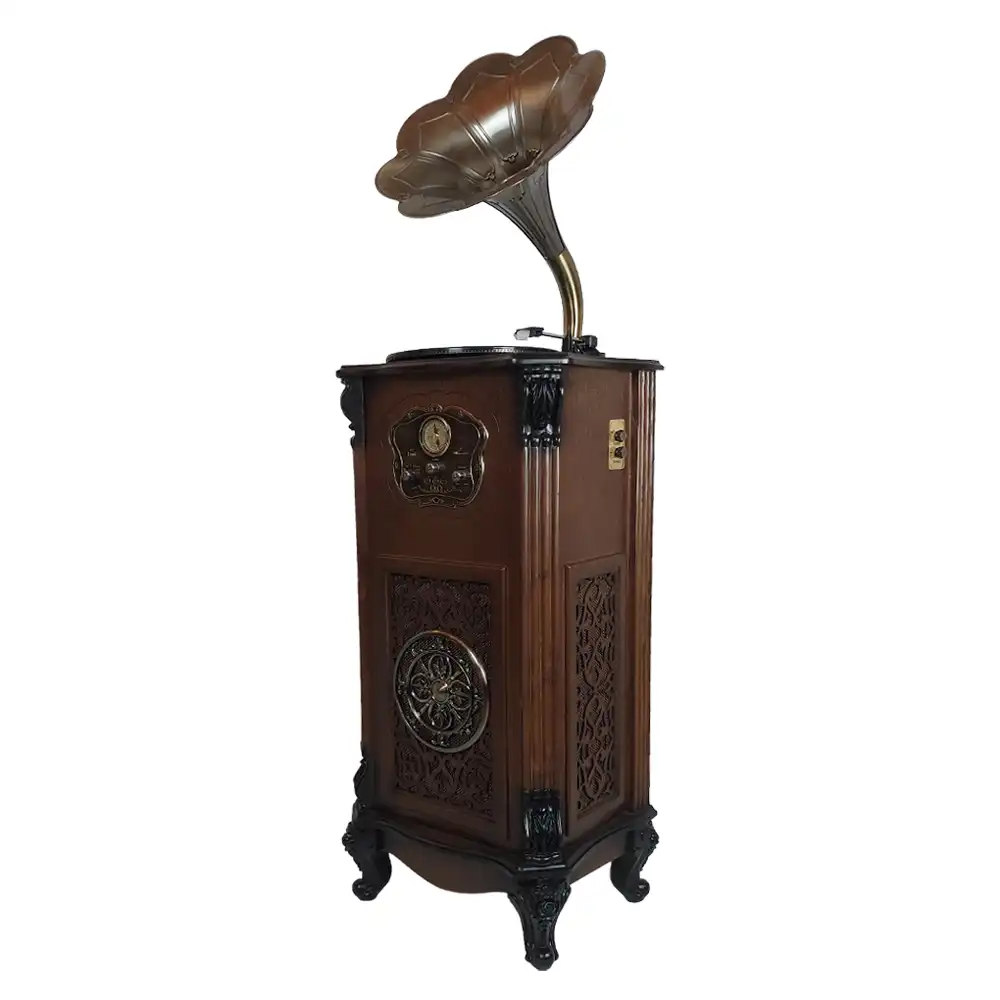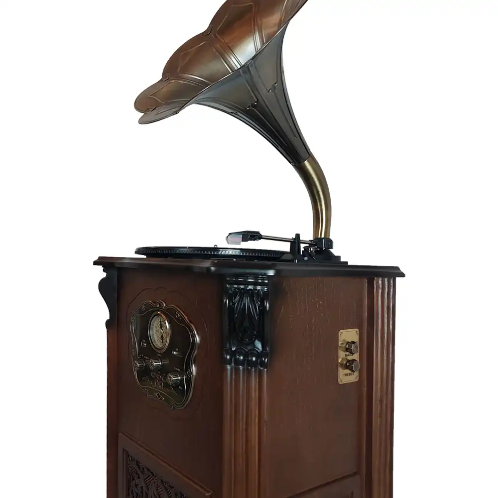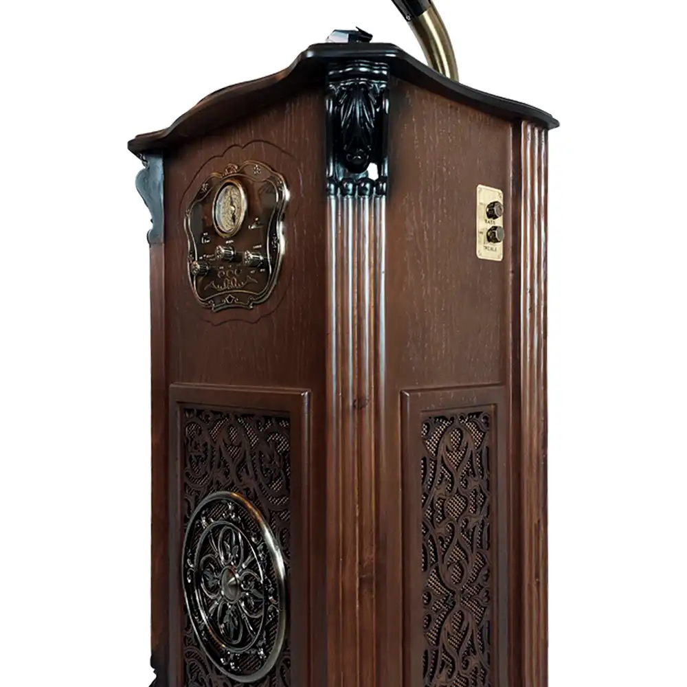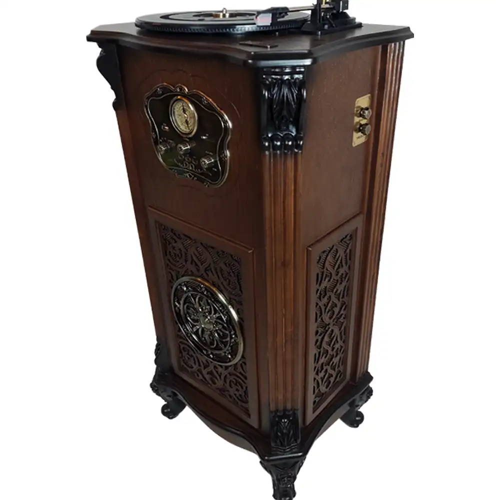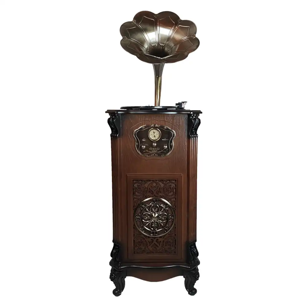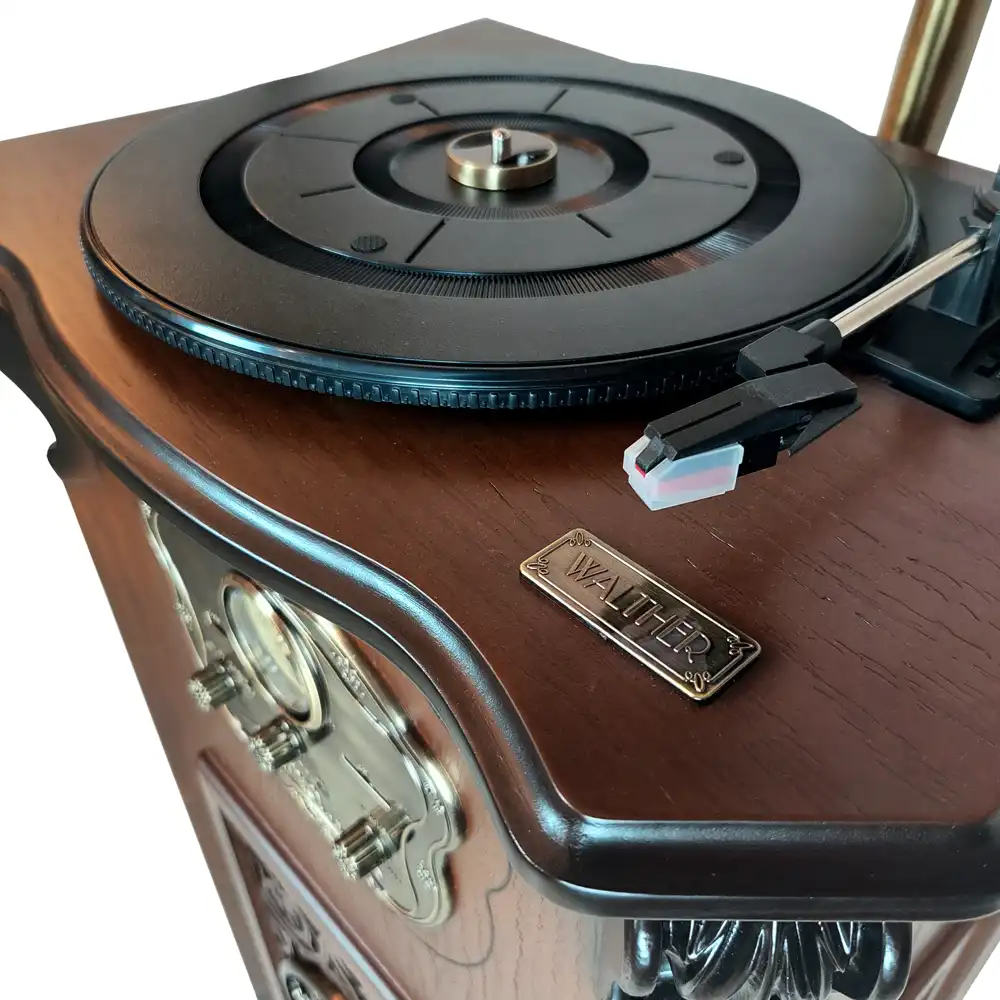 گرامافون والتر مدل 2501 پلاس با شیپور فلزیبدنهٔ چوبی با قالببندی کلاسیک و نقوش مشبک، در کنار پایههای قوسی و تزئینات تیره، حس لوکس و اصالت را تقویت میکند.