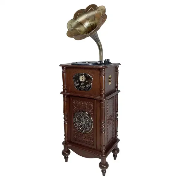 این مدل با چوب مرغوب و منبت‌کاری ظریف ساخته شده و شیپور فلزی طلایی آن، جلوه‌ای خاص و کلاسیک به دکوراسیون شما می‌بخشد. پایه‌های مستحکم و جزئیات فلزی براق باعث می‌شوند این گرامافون هم کاربردی باشد و هم یک عنصر دکوراتیو لوکس.
