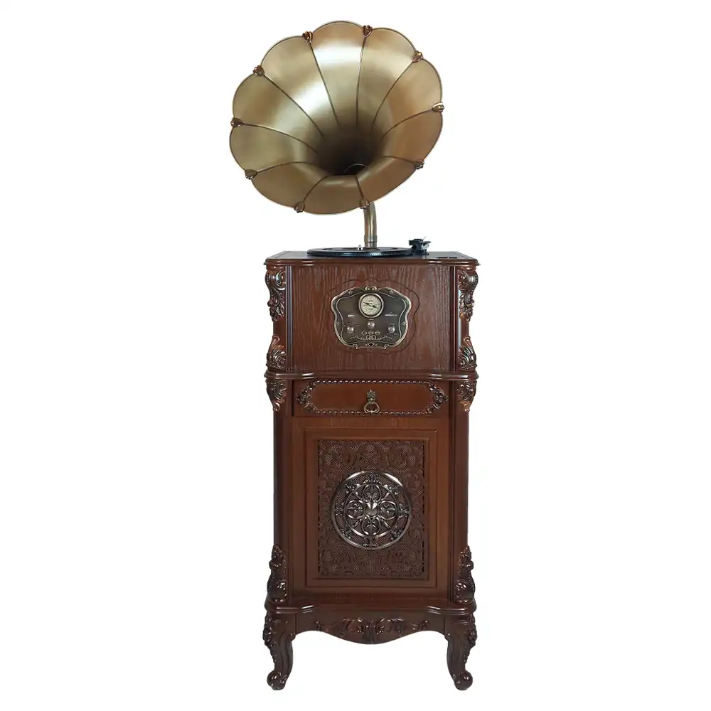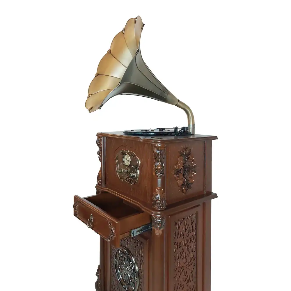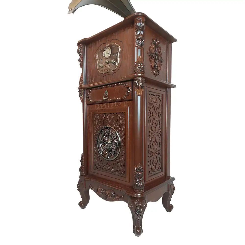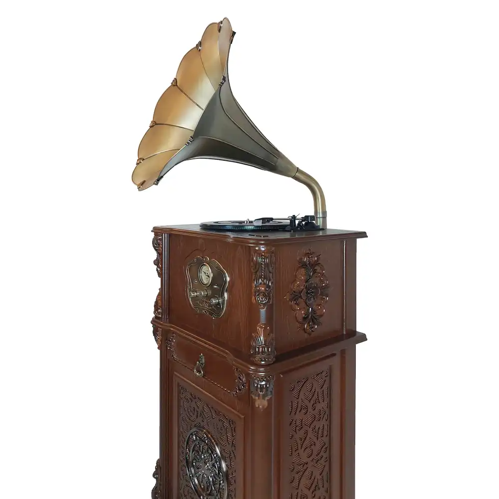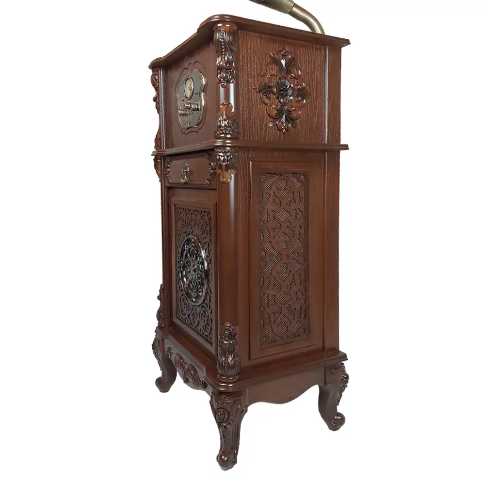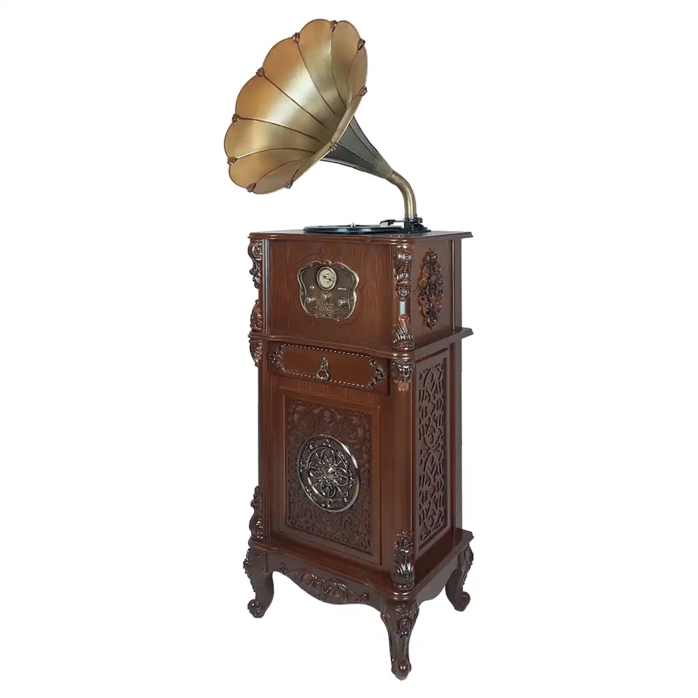 این گرامافون با بدنهای از چوب طبیعی و پایههای قوسدار منبتکاریشده، به دکوراسیون منزل شما جلوهای اصیل و سلطنتی میبخشد.